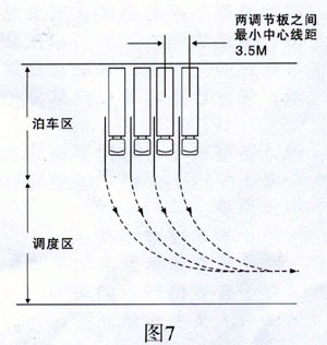 泊車位之間中心線距離建議應(yīng)至少3.5米,(圖7)如要考慮緊靠的兩輛車同時(shí)開(kāi)啟車門,泊車位之間中心線距離最好為4米。平臺(tái)外圍區(qū)域的大小取決于泊位中以線間距離、貨車長(zhǎng)度及貨車的轉(zhuǎn)彎角度。同時(shí),如拖車裝卸貨時(shí),拖車頭會(huì)暫時(shí)脫離開(kāi)貨柜/拖掛車,則所需平臺(tái)外圍區(qū)域可相應(yīng)減小,即該兩組數(shù)值成反比。
