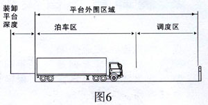 平臺(tái)外圍區(qū)域指的是裝卸貨平臺(tái)前至圍欄區(qū)(或障礙物區(qū))之間可供貨車使用的區(qū)域。它應(yīng)包括裝卸貨時(shí)用于泊車的裝卸區(qū)及調(diào)動(dòng)貨車進(jìn)出裝卸區(qū)所必需經(jīng)過(guò)的調(diào)動(dòng)區(qū)(圖6、圖7)。