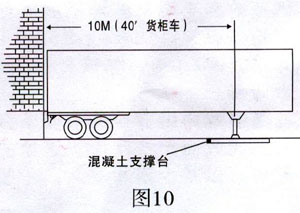 如泊車區(qū)地面沒(méi)有鋪設(shè)混凝土或鋪設(shè)的是瀝青、砂石,在平臺(tái)前適當(dāng)?shù)木嚯x,與平臺(tái)墻壁平行處,需鋪設(shè)堅(jiān)固的混凝土支撐臺(tái),當(dāng)拖車退靠在平臺(tái)前,拖車頭開(kāi)走后,支撐貨柜(或車廂)前部的重量,(圖10)。標(biāo)準(zhǔn)40英尺貨柜車的支撐臺(tái)位距貨柜尾端約10米;20英尺貨柜車,此距離約為3.5米。支撐臺(tái)長(zhǎng)度如能一直延伸至平臺(tái)墻壁更佳,且要有足夠?qū)挾纫赃m應(yīng)不同車輛。為支撐滿載的貨車或有叉車開(kāi)上的貨車,支撐點(diǎn)需有兩個(gè),相距1.8米,各能承重至少12噸, 有時(shí)為了更穩(wěn)固,當(dāng)拖頭馳離貨柜車時(shí),在拖掛車前端放置一活動(dòng)支撐臺(tái),用以減少叉車出貨柜時(shí)的沖擊力。