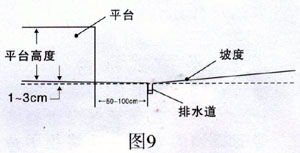 有坡度的泊車區(qū)應(yīng)設(shè)計(jì)完善的排水設(shè)施。排水區(qū)位于平臺(tái)前,從平臺(tái)墻壁向外應(yīng)有稍許坡度(2-3CM),距離排水道應(yīng)有0.5至1米(圖9)。排水區(qū)不能太寬,以減少貨車后軸位置影響貨車車廂與平臺(tái)之間的高度差。