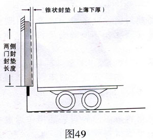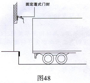 與門罩相比,擠壓式門封更能有效地封閉貨車與平臺間的空隙,且成本較低,但另一方面,門封會令貨臺門洞的寬度減少,有時會影響托板流暢地進出貨車。比如在另一個情況下,貨車尾部有伸出的臺板時,門封的使用會受到影響(圖44)。平臺門寬于2.8米或高于3.0米時,不能使用門封。