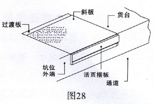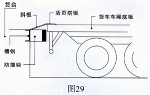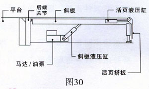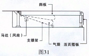 ● 低壓空氣動力系統設計簡單(圖31)它利用一個與強力鼓風機連接在一起的氣袋提升起斜板,斜板靠自身重量在下降時利用推桿推出搭板,搭在貨車車廂底板上。這種設計新穎,適合不同溫度地區。(氣袋作用只是提升斜板;不起任何承重作用)。