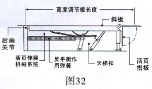● 手動機械彈簧式調節板(圖32)由主動力彈簧產生向上的升力,彈起斜板,( 靜止狀態時,由天梯扣結構扣住斜板,限制斜板的上升)使用時,拉起與天梯扣結構連在一起的釋放鏈,斜板彈起,操作人員走上斜板,靠自身重量壓下斜板,斜板下落過程中,搭板自動伸出搭在貨車車廂底板上,天梯扣重新扣住斜板,使其不會重新彈起,即可開始裝卸貨。機械式調節板需定期的保養和調校,才能保證有效動作。現只在不方便提供電源的空曠區域,如大廣場、集裝箱堆垛場及臨時規劃的場合使用。