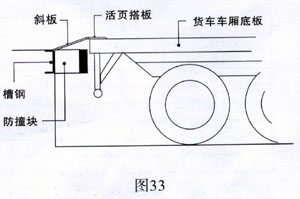 臺邊式調節板(EOD)成本低,但調節范圍小,僅在貨臺平面以上 1 2 . 5 cm至以下 1 2 . 5 cm,適用于貨車底板與平臺高度差距很小的情況且要注意裝卸工具(如叉車)底盤距地面空隙不可過小。(圖33)